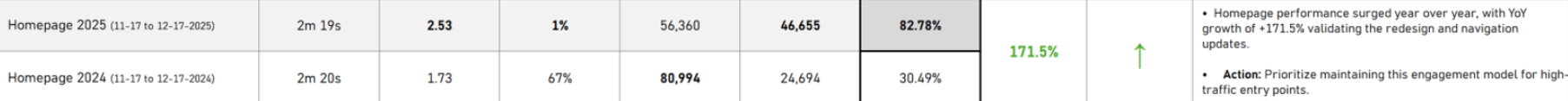 The redesign process was driven by user research and data analysis to identify pain points and areas for improvement on the existing homepage. Pain points included: